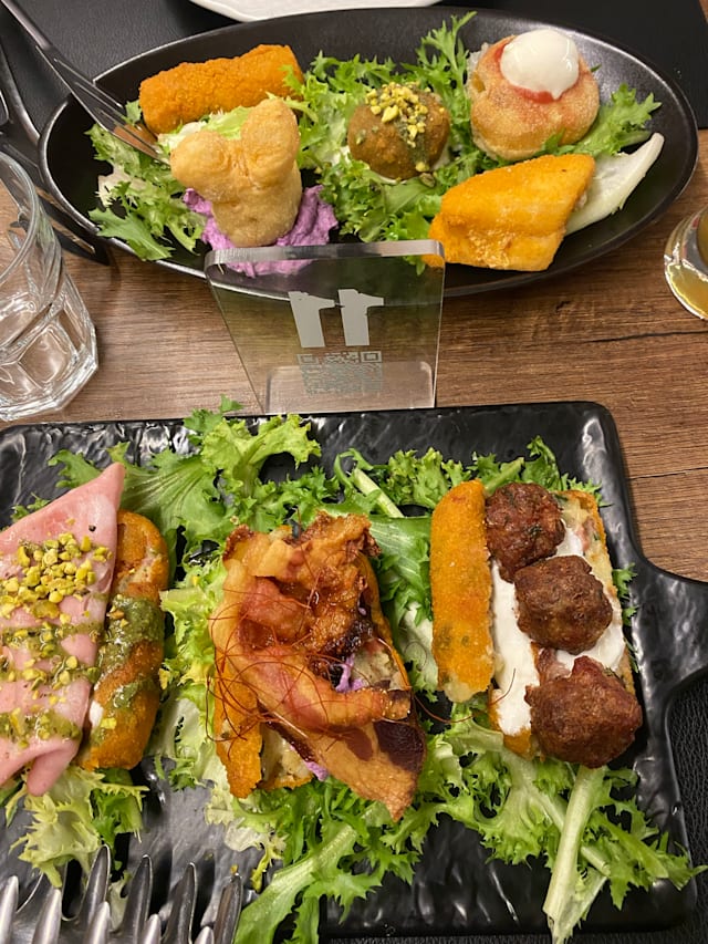 Crocchettone stracciatella, pistacchio e mortedella, crocchettone crema di cavolo viola guanciale croccante e fili di peperoncino, crocchettone stracciatella e polpette di carne.