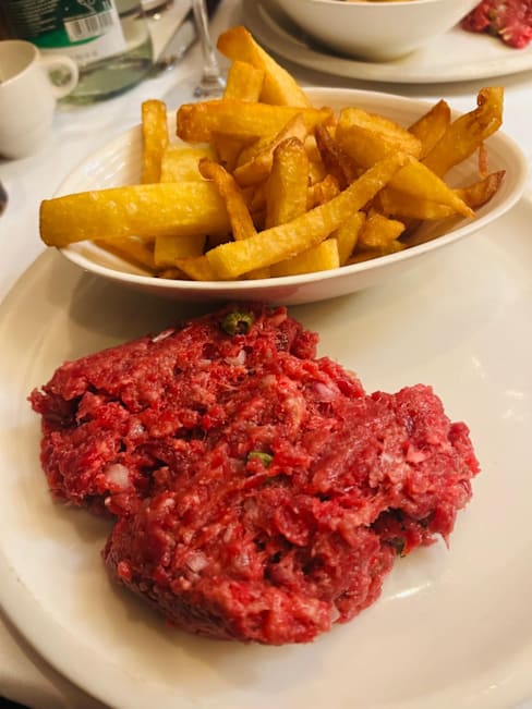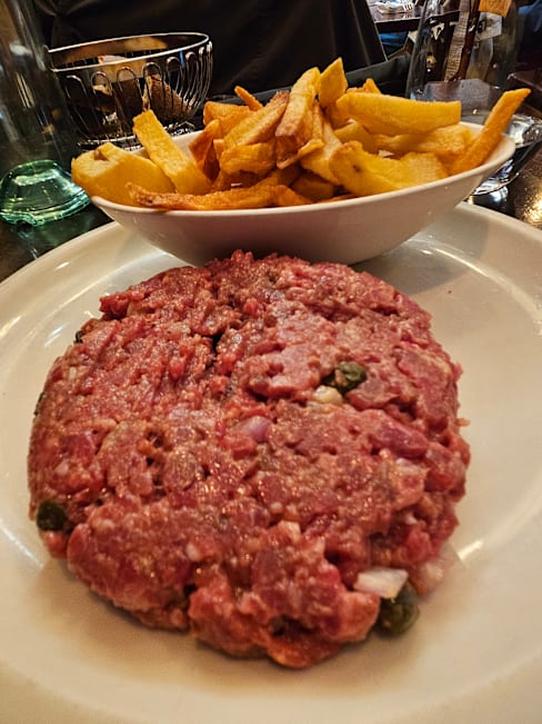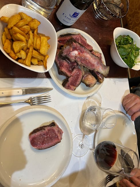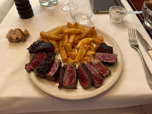 10/10At a mere 10 tables, it’ll take a while to reach everyone, but this is one of the world’s great locations for beef. Yes, Spain has a couple of glorious exponents of steak, as do the U.S. & Japan, of course, but the flavors evoked here are just as extraordinary. The intimacy of the place is conducive to interacting with other diners without losing a sense of privacy for most of the meal. I suppose you could specify how you want your meat cooked, but my server (Gaël, whose English is great) just took my order and left. The tomato salad was deliciously simple and perfect for this time of year. The faux filet (strip steak) that arrived was a revelation. It might look a bit raw, but don’t worry—it is absolutely unlike similarly-colored Angus beef—it’s just right. I gather they use Charolais beef, or a similar breed, and prepared this way, it highlights the kaleidoscope of flavors I was unaware this meat naturally has. The fries actually helped to reveal this aspect, too. What a lucky find!