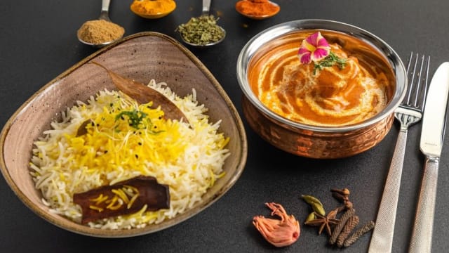 Curry d'Agneau préparé dans la sauce yaourt et épice Indien Garam Masala, beurre indien et oignon frit. Accompagné de Riz Basmati