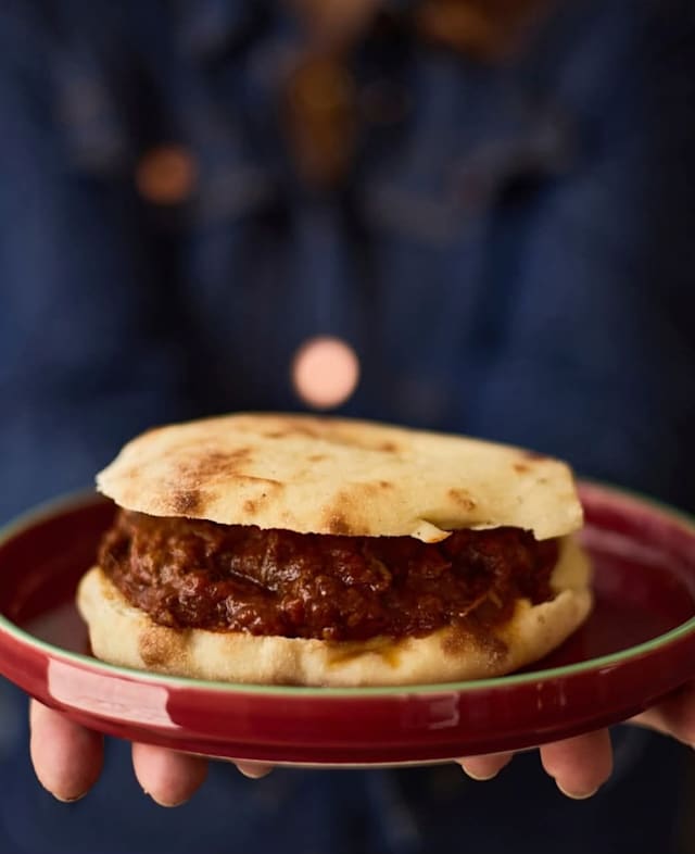 Schiacciatina, cavolo cappuccio croccante, formaggio pecorino fresco, patatine fritte, senape al miele e maionese al basilico