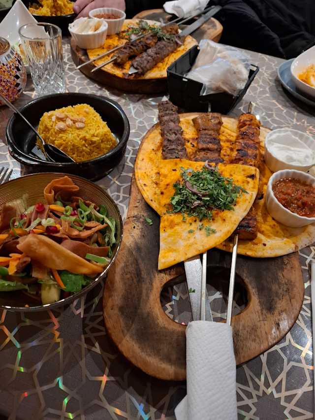 - Mix van shish taouk, kabab en shekaf. Geser·veerd met rijst en een kleine salade.