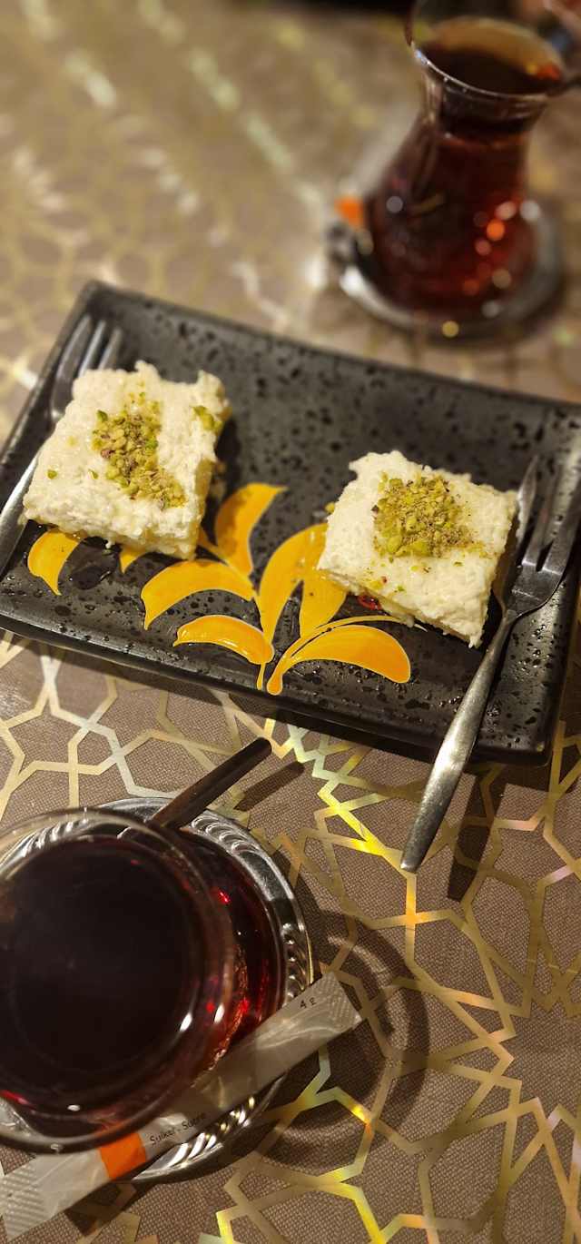 - Zachte romige kaas, met griesmeeldeeg, fijne pistache en suiker- rozenwater.
