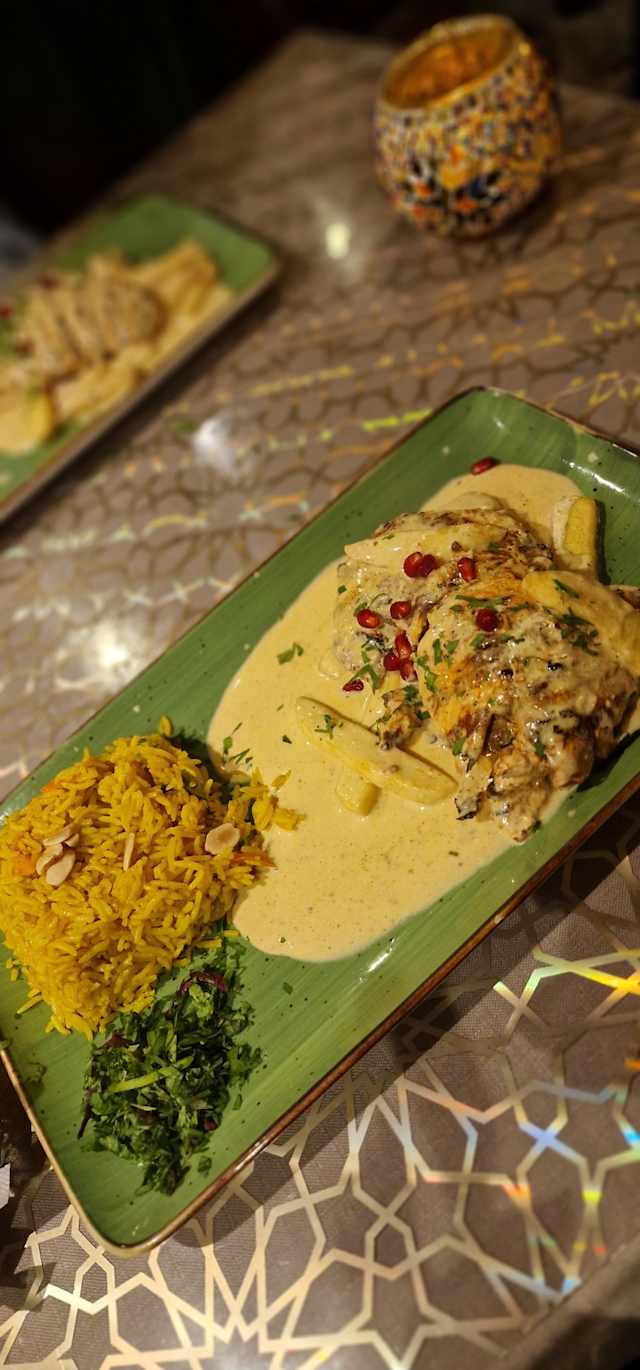 - Traditioneel gerecht van syrisch brood, witte rijst en kipfilet een mix van tahini, yoghurt, knoflook en citroen