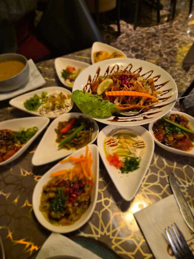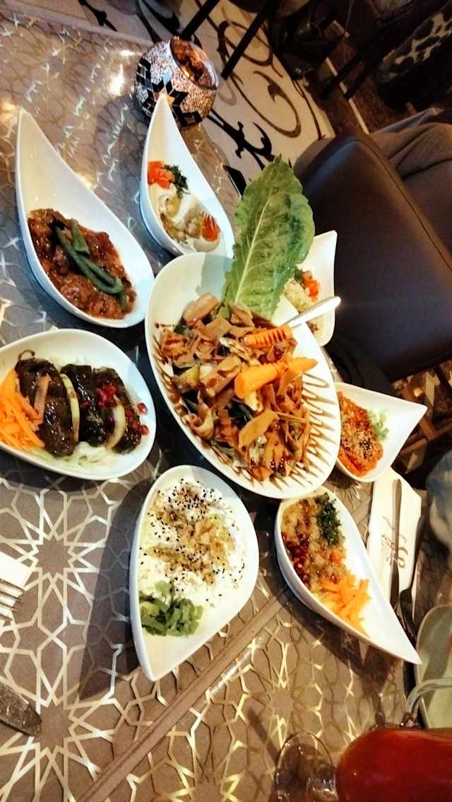 - Gegrilde aubergine gemixt met groenten en granaatappelmelasse.