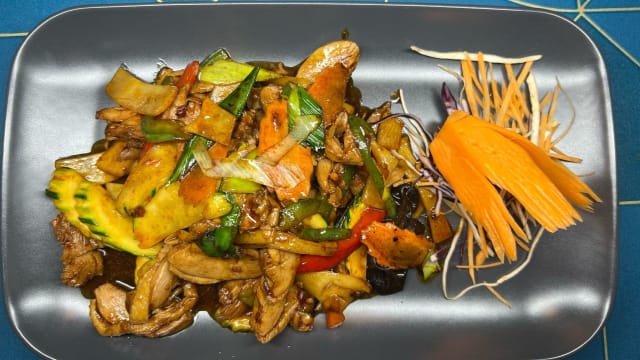 Pâtes , boeuf, poivrons, carotte et pak choi