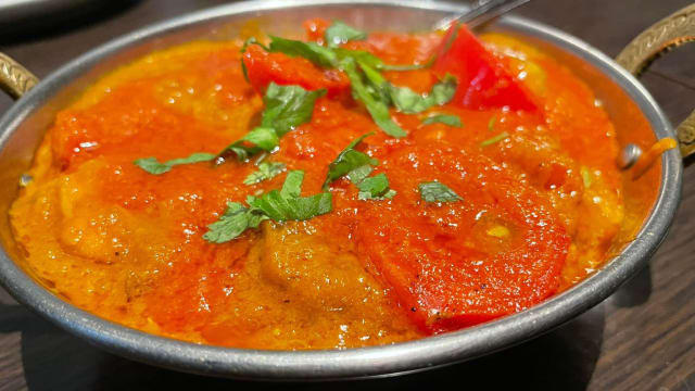 - Gesneden zacht lamsvlees, gemarineerd met verse munt, yoghurt, vien, paprika en korianderzaad, vervolgens geroosterd in de tandoor-oven.