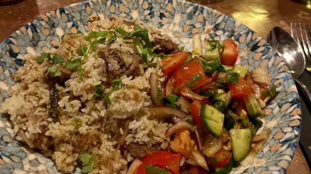 Lamb roast fillet, peppers, mushrooms, chili flakes and mint in a spicy korai cas- serole served with pilao rice on the side.