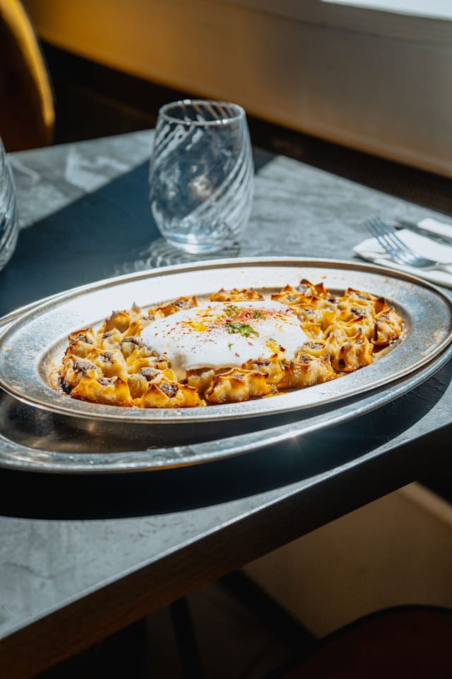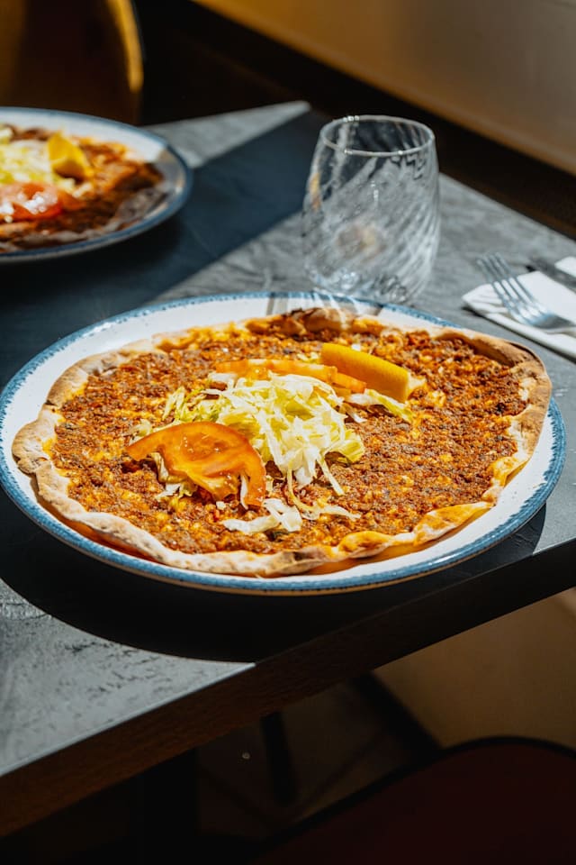 Pâte maison, viande hachée de bœuf, oignon, beurre fondu, persil, épices, servi avec yahourt et summac (garnitures au choix : frites, salade , riz ou boulghour) (sauce maison : sauce à l’ail, sauce tahin)
