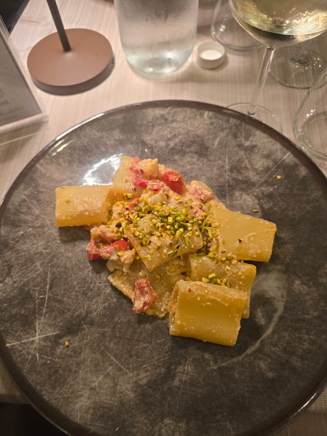 Paccheri napoletani al gamberone con datterini, ricotta fresca, granella di pistacchio e peperoncino