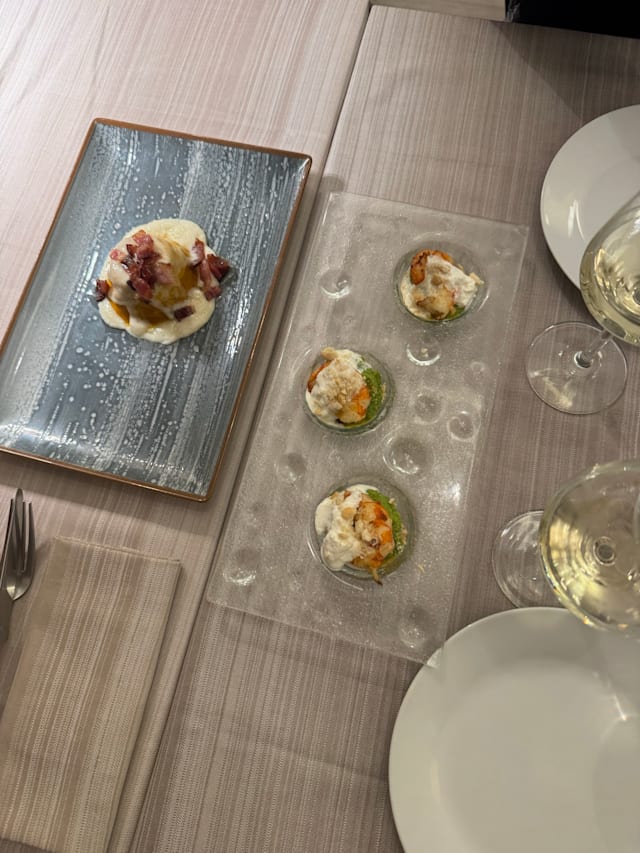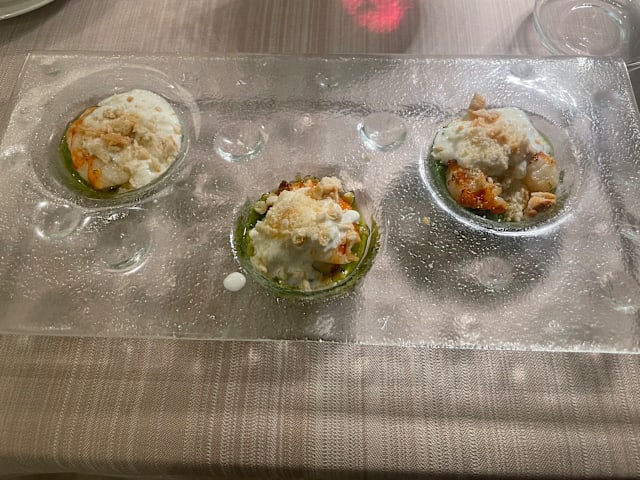 Gamberoni su crema di piselli con stracciatella e sbriciolata di tarallo pugliese