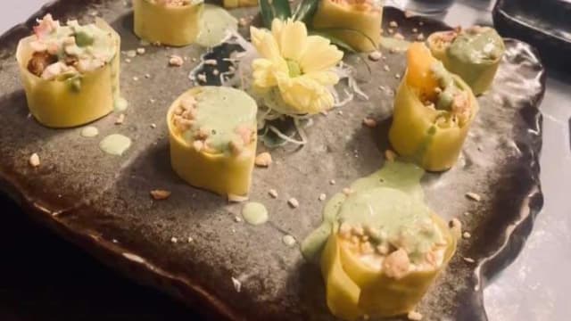 Foglia di soia, insalata, mango, gamberi, calamari, philadelphia, tobiko, polipo, astice, arachidi con salsa thai