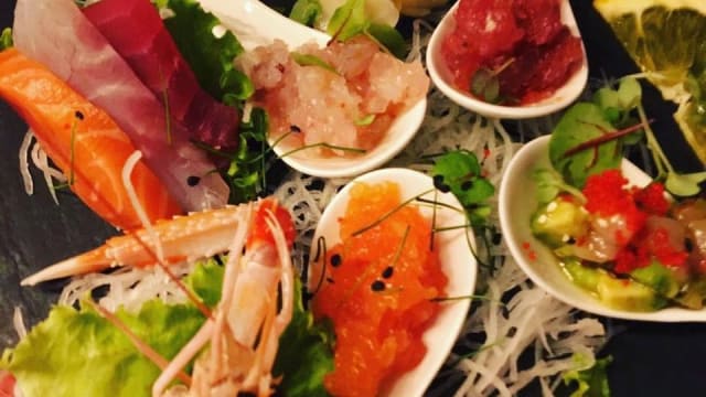 Tonno, salmone, branzino, gamberi, salsa speciale e olio flambé