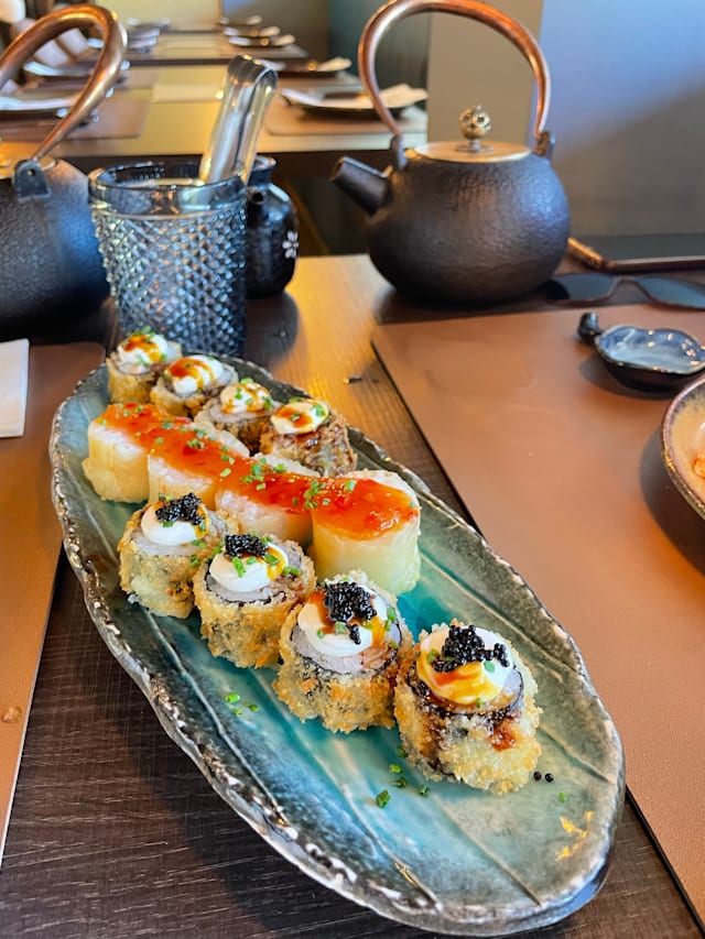 Salmão, crispy de alho francês e philadelphia enrolados em omelete japonesa.