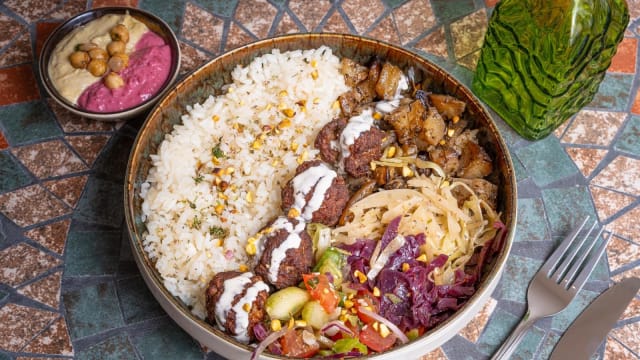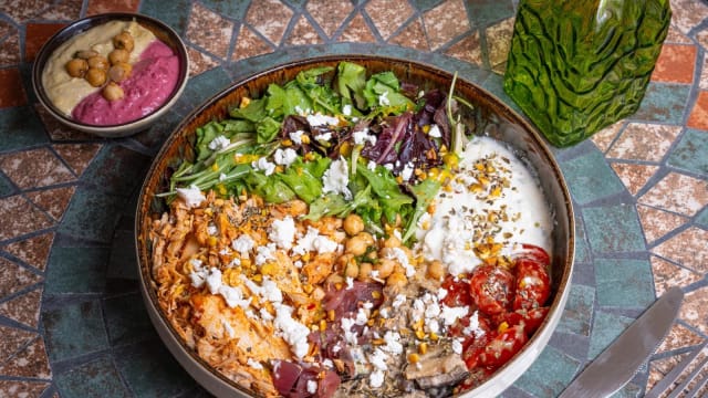 garni de choux rouge, aubergines sésame zaatar et d'une salade fraiche herbes, sauce tehina