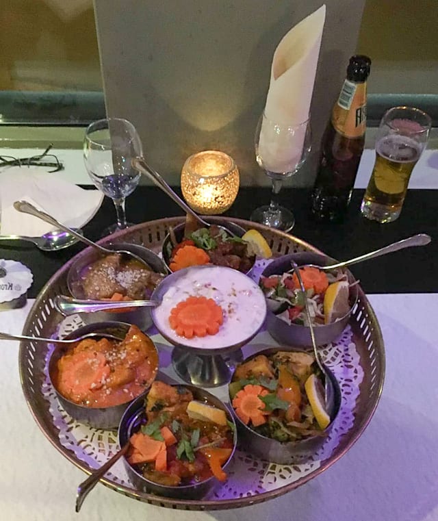 Samosa, murg navratan, beef bhuna, mushroom bahjee, rijst, salade, naan, papadum. Bestaan uit voorgerechten, twee hoofdgerechten, bijgerechten, rijst, naan, salade en papadum