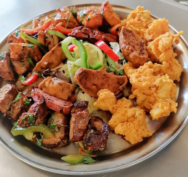 Gebakken rijst met diverse vlees. Geserveerd met groentecurry