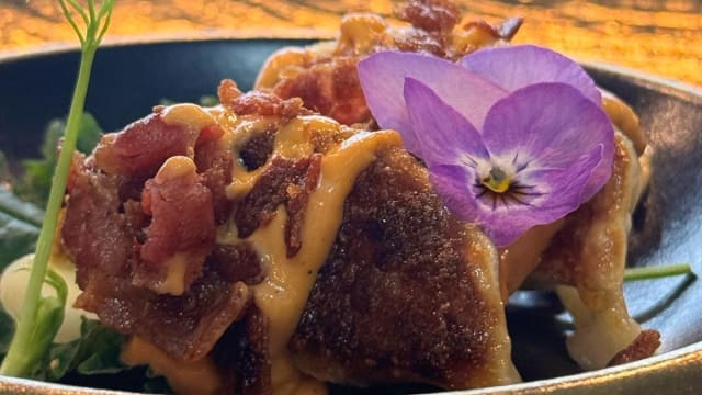 - Hoso fritto salmone, salsa basilico, pano fritto