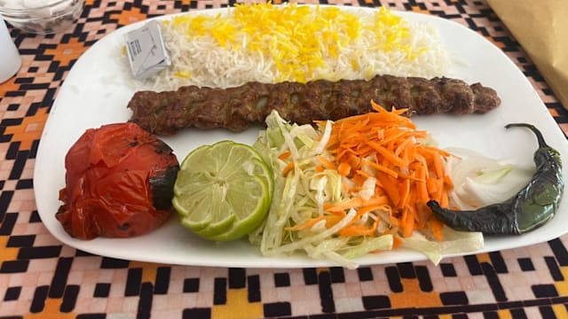 Spiedi di filetto di pollo allo zafferano persiano e macinato di vitello, servito con riso basmati o insalata.