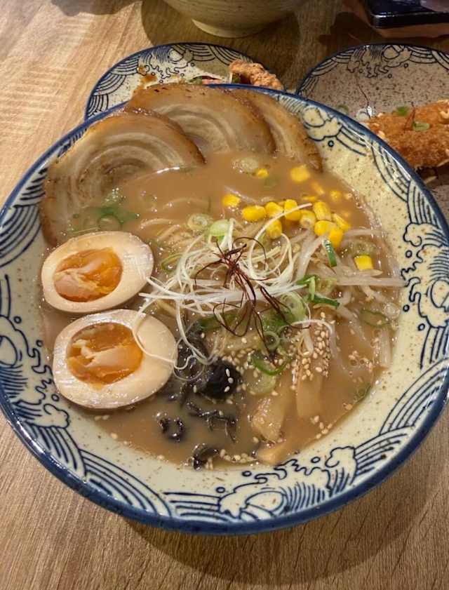 - Bouillon de porc, deux tranches de chashu, champignons noirs, pousses de soja, algue, bambou, maïs, filaments de piment, ciboulette et sésame.