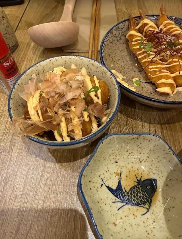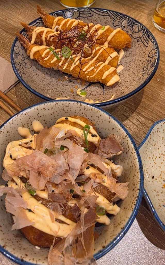 - Boulettes de poulpe avec bonite séchée, sésame, ciboulette, sauce teriyaki et spicy mayo.