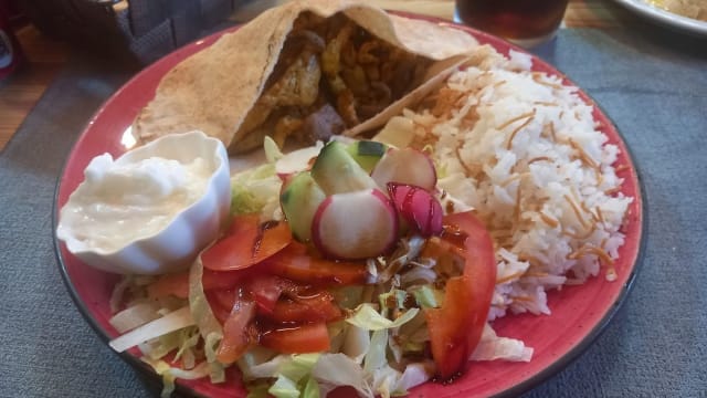 - Tres brochetas: cordero, pollo y kafta acompañadas de arroz y verduras a la pamila