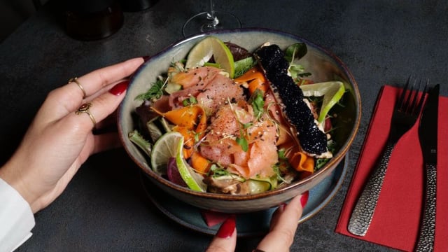 Tartare de saumon façon thaï, yakitori et coriandre -