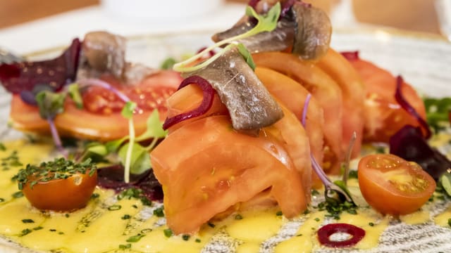 Amanida de brots frescos, mix de tomàquets km0, alvocat i tonyina en semisalaó
