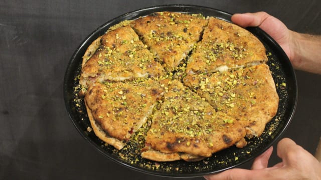 Mozzarella di bufala ennese, mortadella d'asina, crema di pistacchio, burrata, polvere e granella di pistacchio