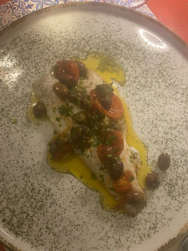 Filetto in padella con olive nere, capperi e pomodorini.