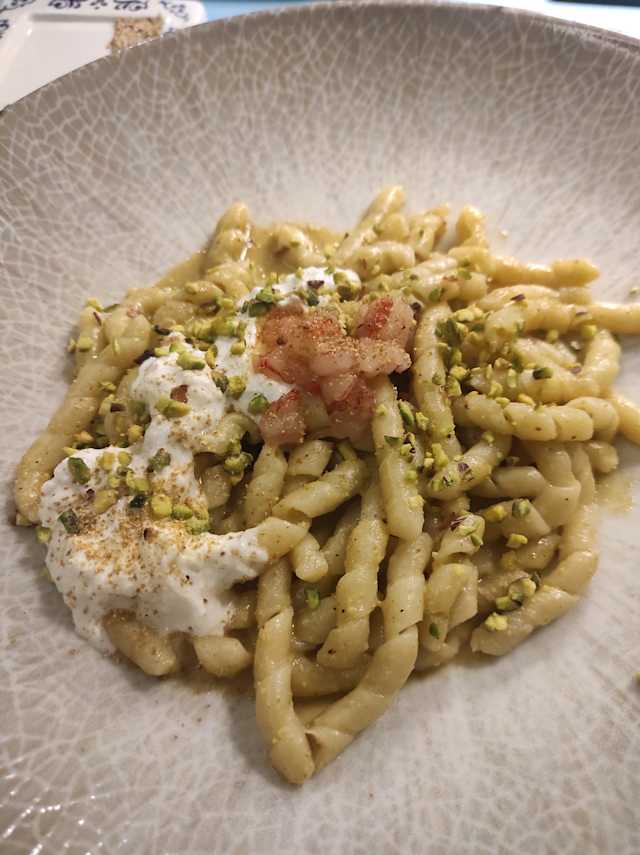 Con pesto di pistacchio e fagiolini.