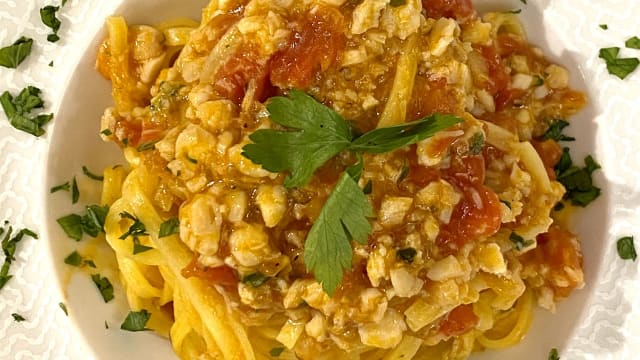 Spaghettone al pomodoro con pinoli, acciughe, uvetta e pangrattato tostato.