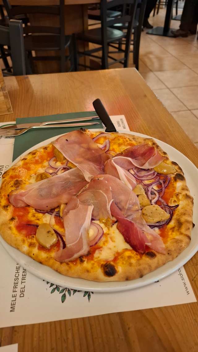 - Pomodoro, mozzarella fior di latte, speck trentino stagionato, funghi porcini e cipolla rossa