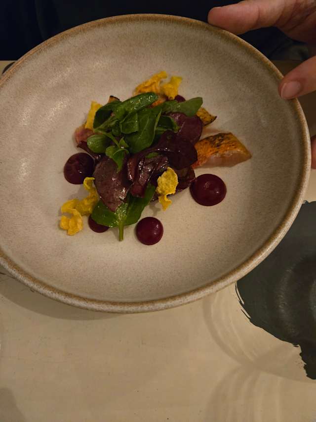 - Filet de rouget barbet en tataki – Purée de betterave rouge à la framboise – Chips de betterave – Salade de pousse de betterave