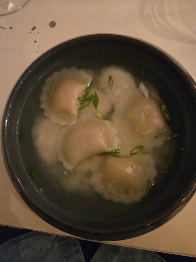 - Soupe miso et fond de volaille maison – Ravioles de foie gras frais au beurre – Tteok (gâteaux de riz coréens) – Cebette Thaï