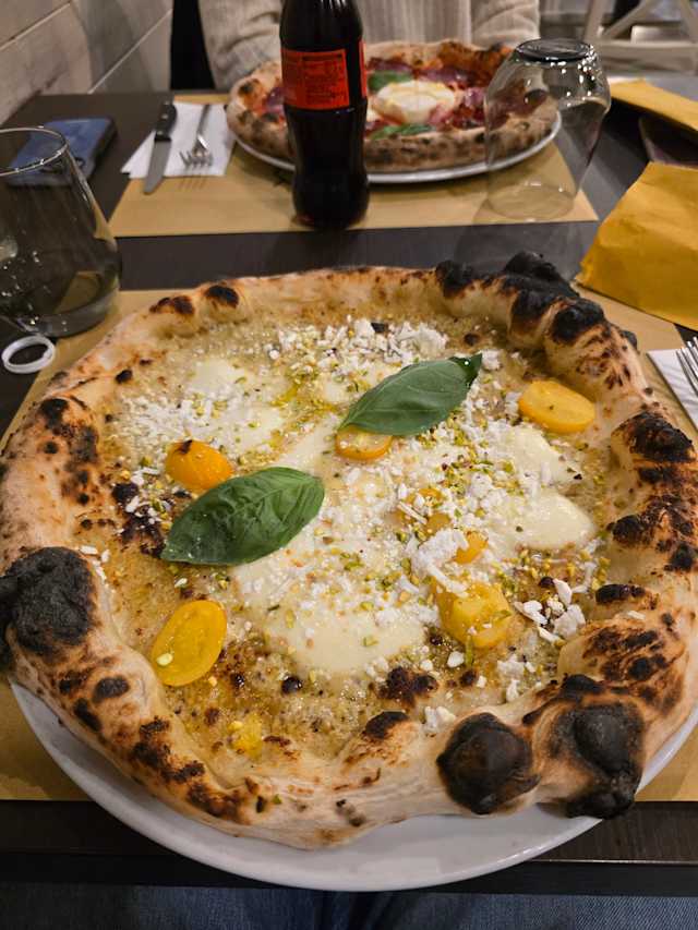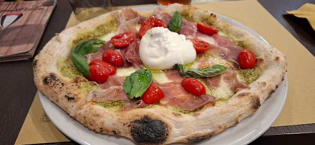 - Crema di pesto alla genovese, mozzarella fior di latte, burrata, prosciutto crudo di Parma, pomodorini datterino
