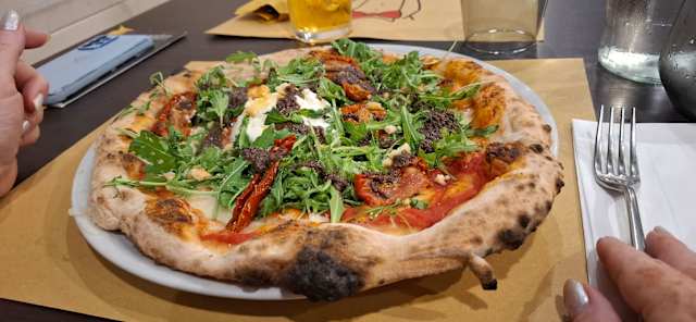 - Con rucola, pomodorini, cipolla, olive e mozzarella