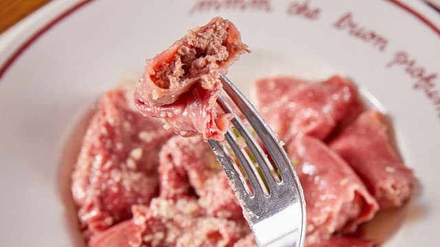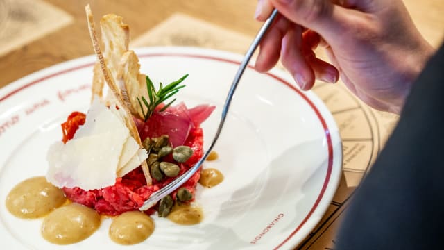 Tartare di fassona piemontese, sfoglie croccanti al parmigiano reggiano, cipolla rossa agrodolce, scaglie di parmigiano reggiano DOP 24 mesi “gennari”, olive taggiasche e senape al miele