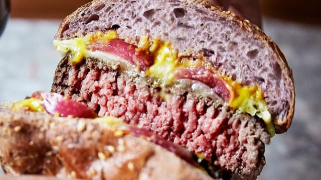 Pane, burger di bovino adulto, fontina DOP, insalata, pomodoro fresco, guanciale croccante, cipolla rossa agrodolce e maionese al Traminer, servito con patate fritte e salse