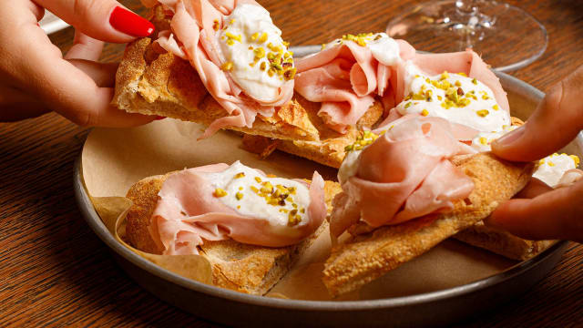 Focaccia bianca con mortadella favola gran riserva “palmieri”, stracciatella pugliese e granella di pistacchio