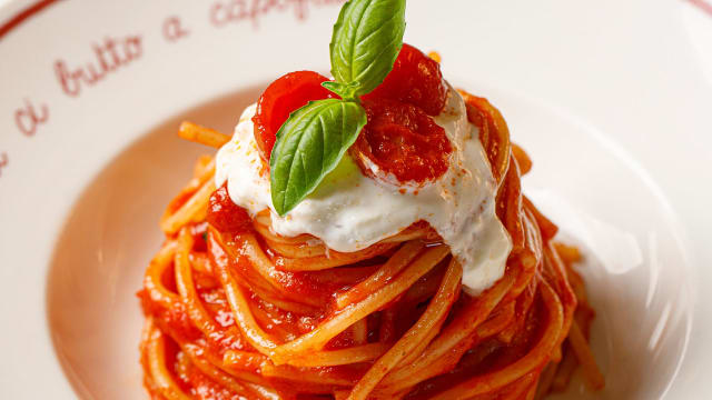 Spaghetti al pomodoro e parmigiano reggiano DOP con stracciatella pugliese