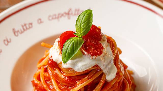 - Spaghetti with tomato sauce and parmigiano reggiano PDO cheese with apulian stracciatella cheese and fresh basil
