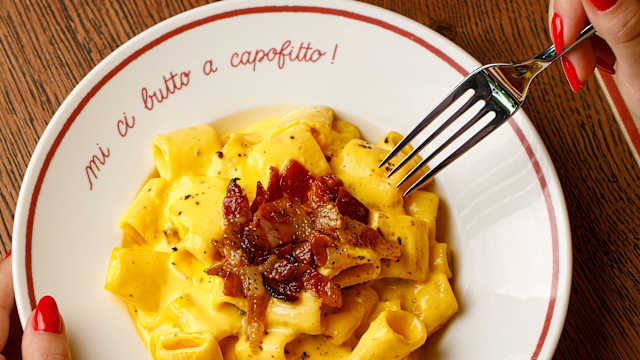 - Mezze maniche pasta with crispy pork jowl marinated in black pepper, eggs and pecorino romano cheese