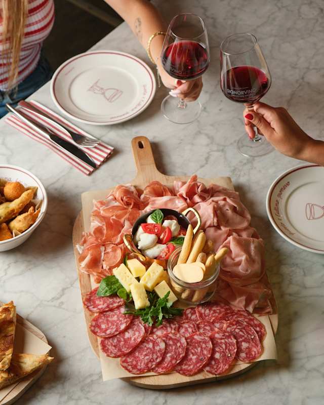 - Prosciutto di parma DOP 24 mesi “piazza peppino” • mortadella favola gran riserva “palmieri” • salame campagnolo “peveri” • culatello di zibello DOP • prosciutto cotto alle erbe bracello “leoncini” • ciliegine di bufala con pomodorini • asiago DOP di vacca bruna • parmigiano reggiano DOP 24 mesi • caprino in crosta di pistacchio • gorgonzola dolce DOP • confettura di prugne e chianti DOCG • focaccia pinsa • gnocco fritto • mini grissini “zorzi” • sfoglie croccanti al parmigiano reggiano (consigliato per 4 persone)