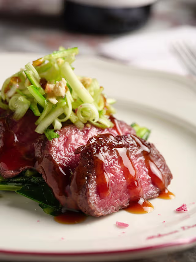 - Filetto di bovino adulto alla griglia con sale maldon al vino rosso, fondo bruno e verdure di stagione al forno