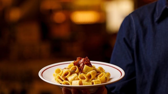 Mezze maniche con guanciale croccante marinato al pepe nero, uova e pecorino romano, in aggiunta con scaglie di tartufo nero