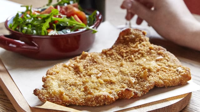 Cotoletta di maiale con panatura di grissini “zorzi” e scorzetta di limone, servita con patate novelle al forno e maionese al traminer (disponibile anche nella versione valdostana con l’aggiunta di prosciutto cotto alle erbe e fontina DOP)