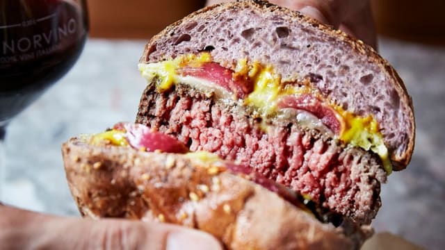Pane, burger di bovino adulto, fontina DOP, insalata, pomodoro fresco, guanciale croccante, cipolla rossa agrodolce e maionese al Traminer, servito con patate fritte e salse