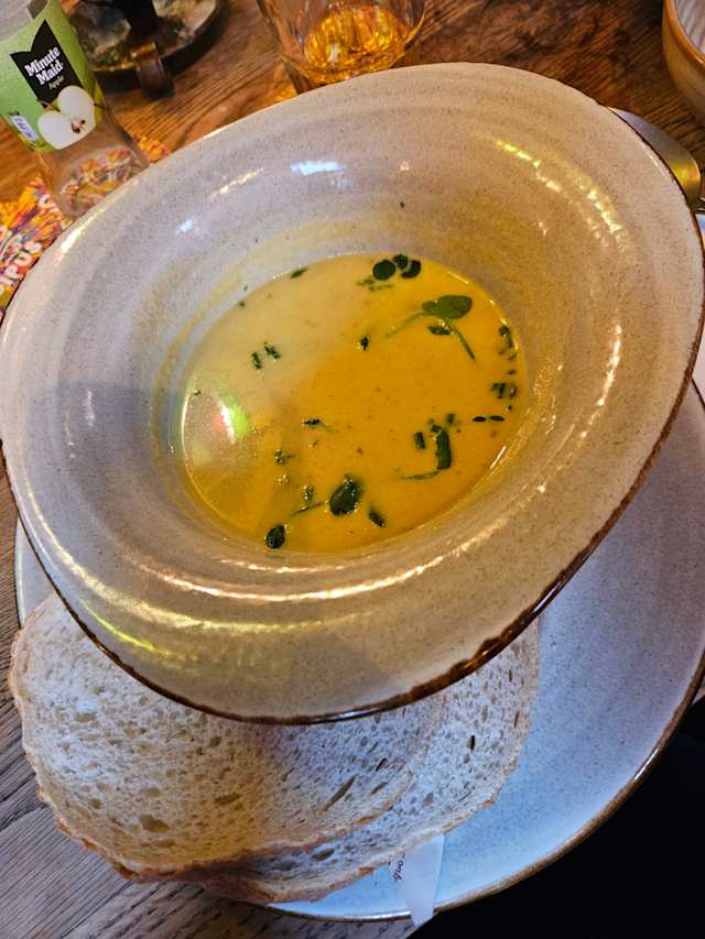 - Kroket en carpaccio op landbrood met een klein soepje