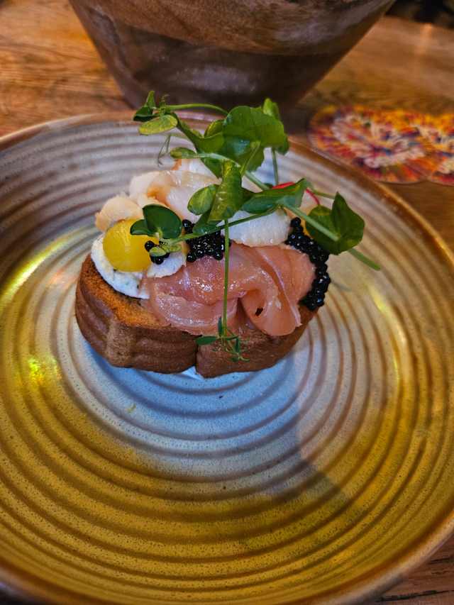 - Met gerookte zalm, heilbot en forel, afgewerkt met haringkaviaar