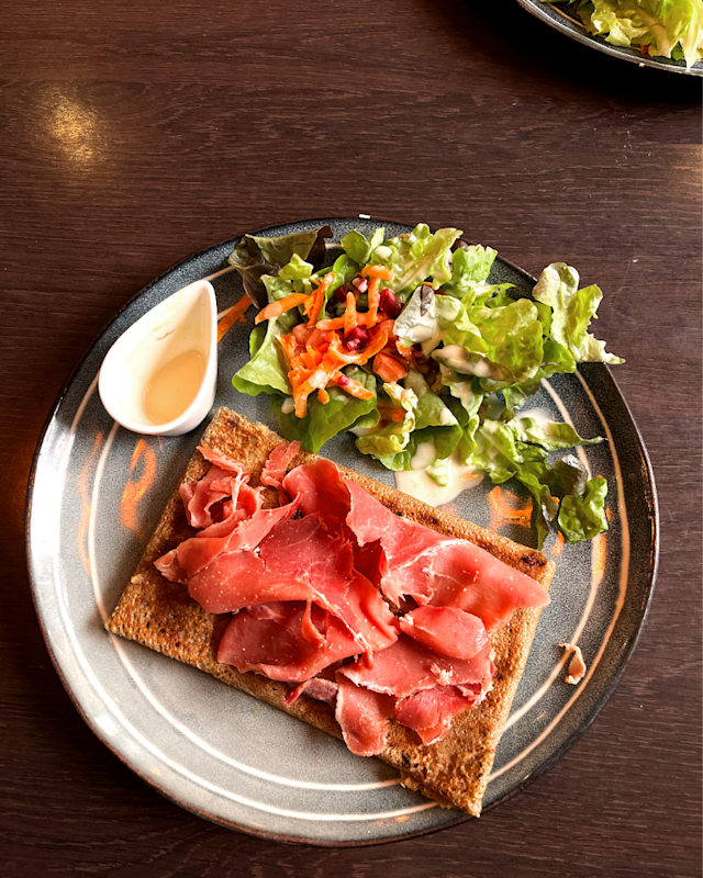 - Pomme de terre au four, jambon blanc, maroilles, emmental, jambon serrano, crème de ciboulette, et toasts